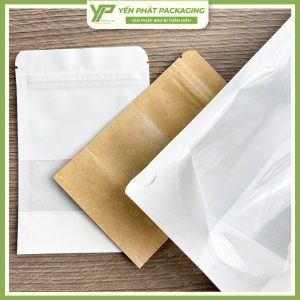 - Đặc điểm: Túi được làm từ giấy Kraft tự nhiên, dễ phân hủy. Bên trong thường có lớp lót bạc để chống ẩm. Khóa zip tiện lợi, giúp người dùng dễ dàng đóng mở.